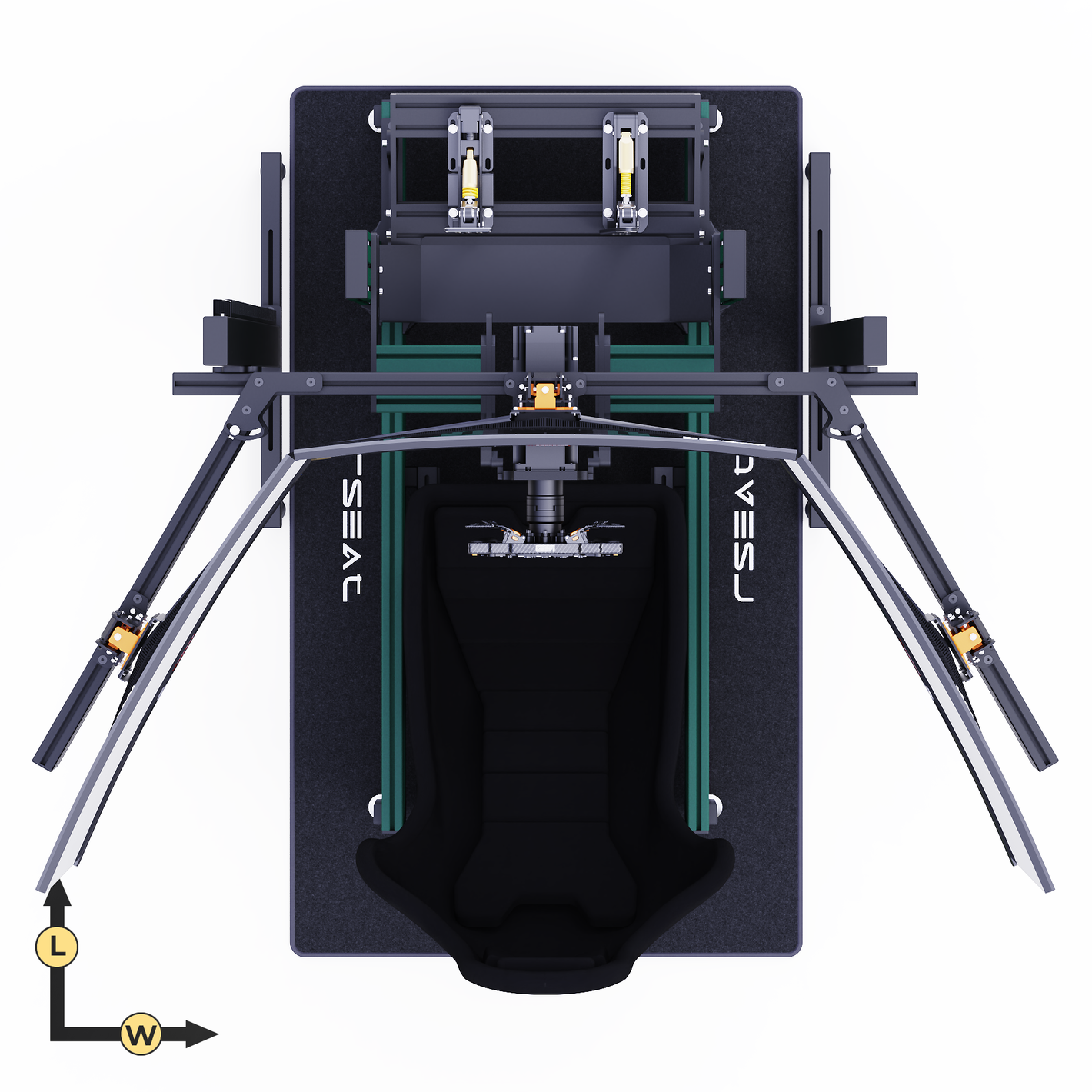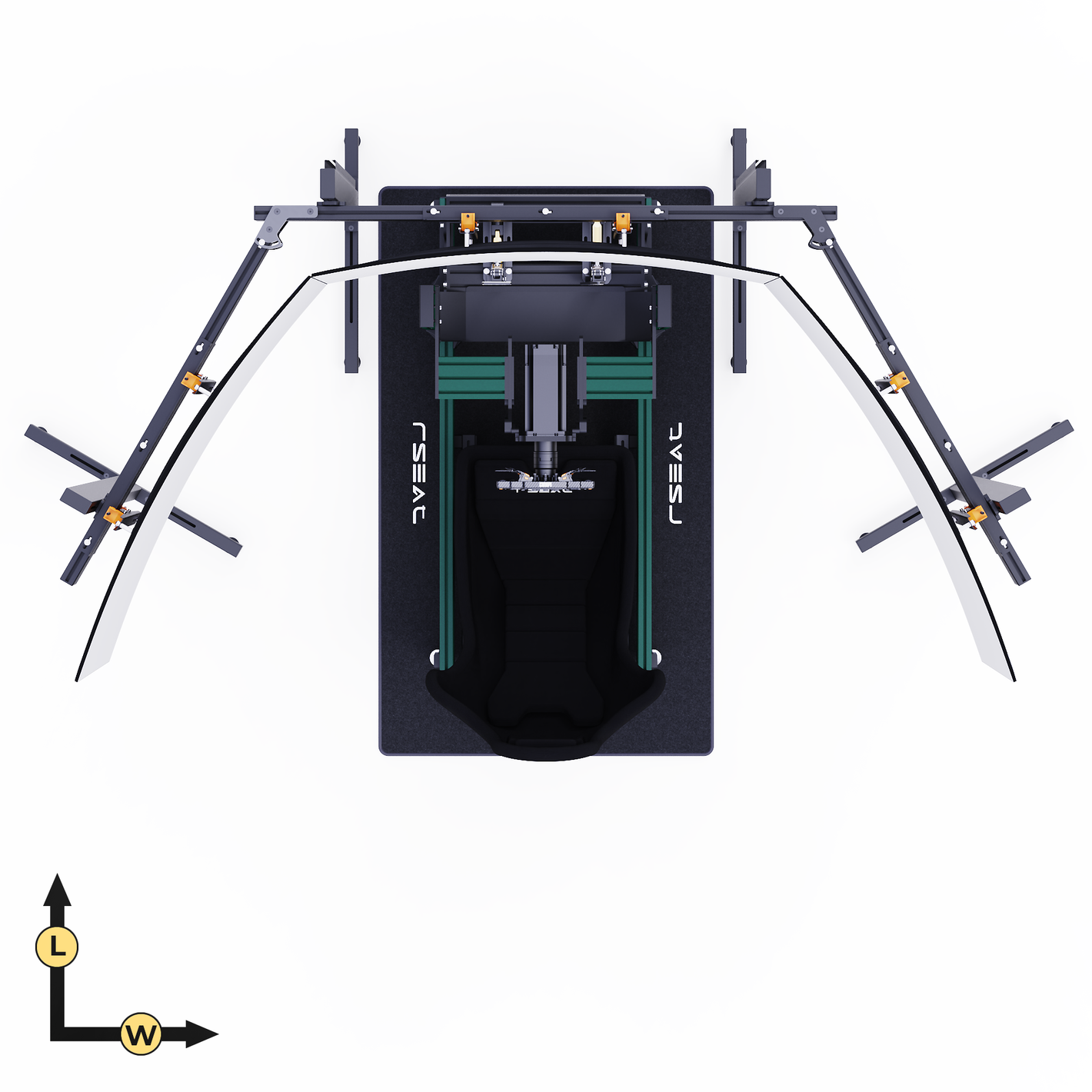 The required minimum footprint for the A1 PRO Formula chassis, RSEAT Formula seat, and A1-TX32 integrated single-screen monitor stand. (supports up to 3 x 32-inch Monitors).