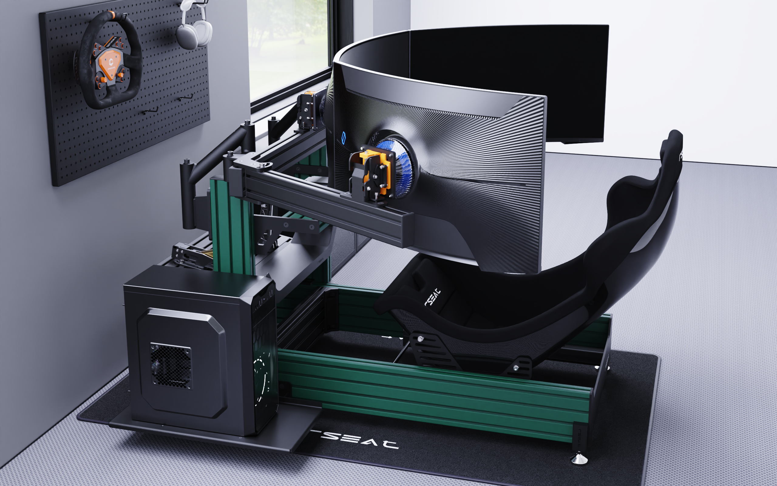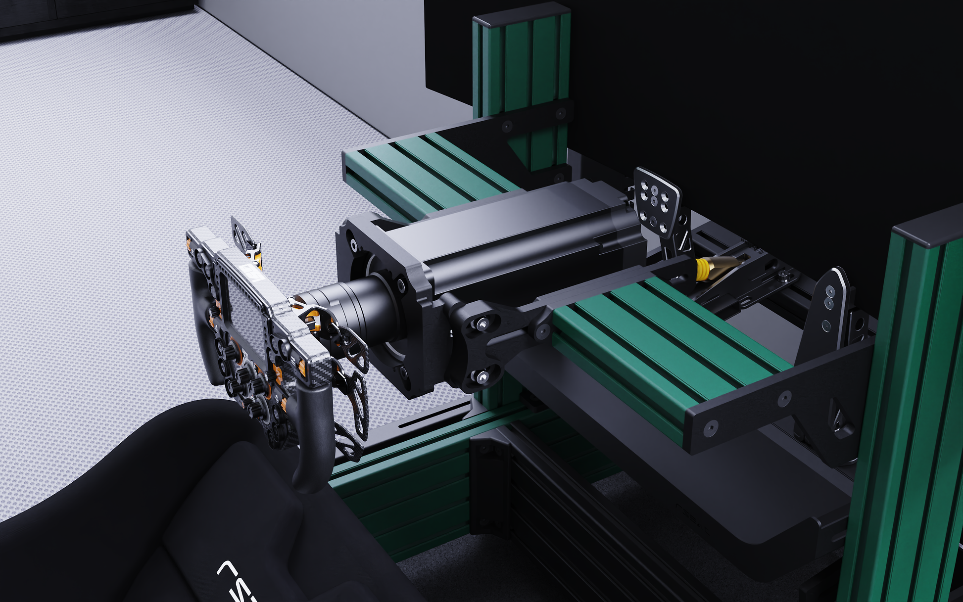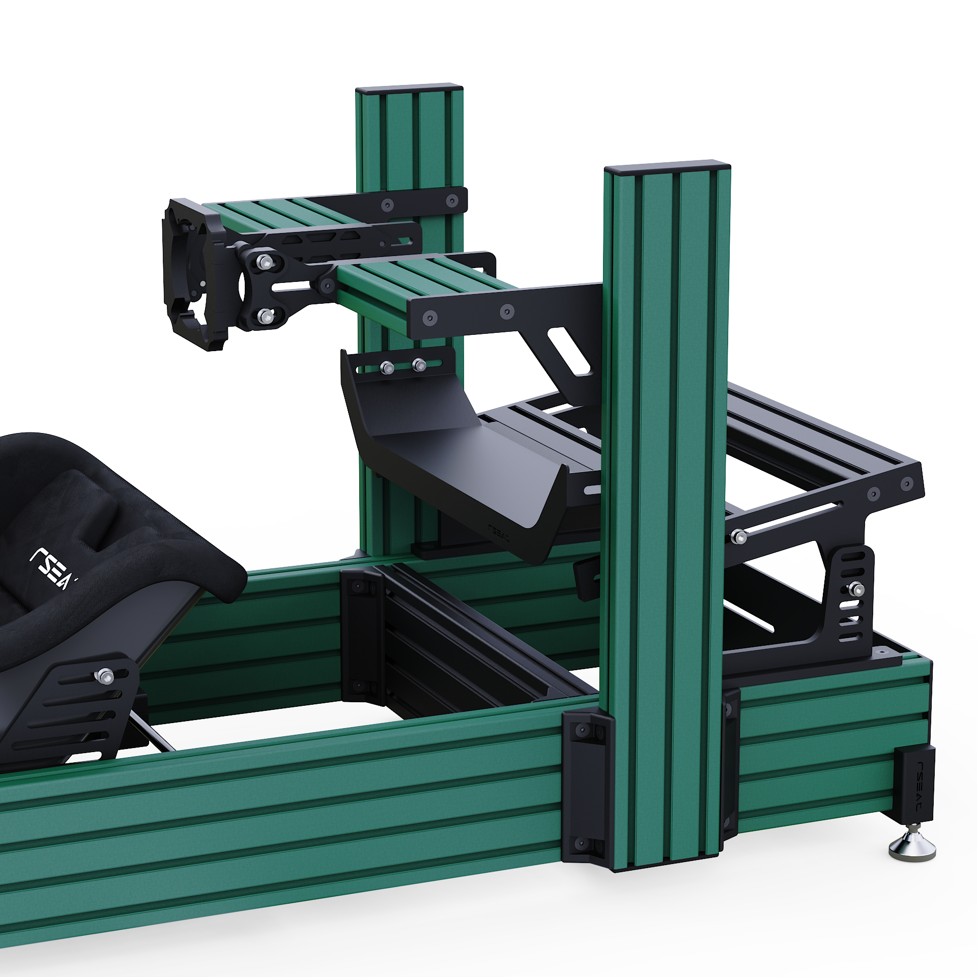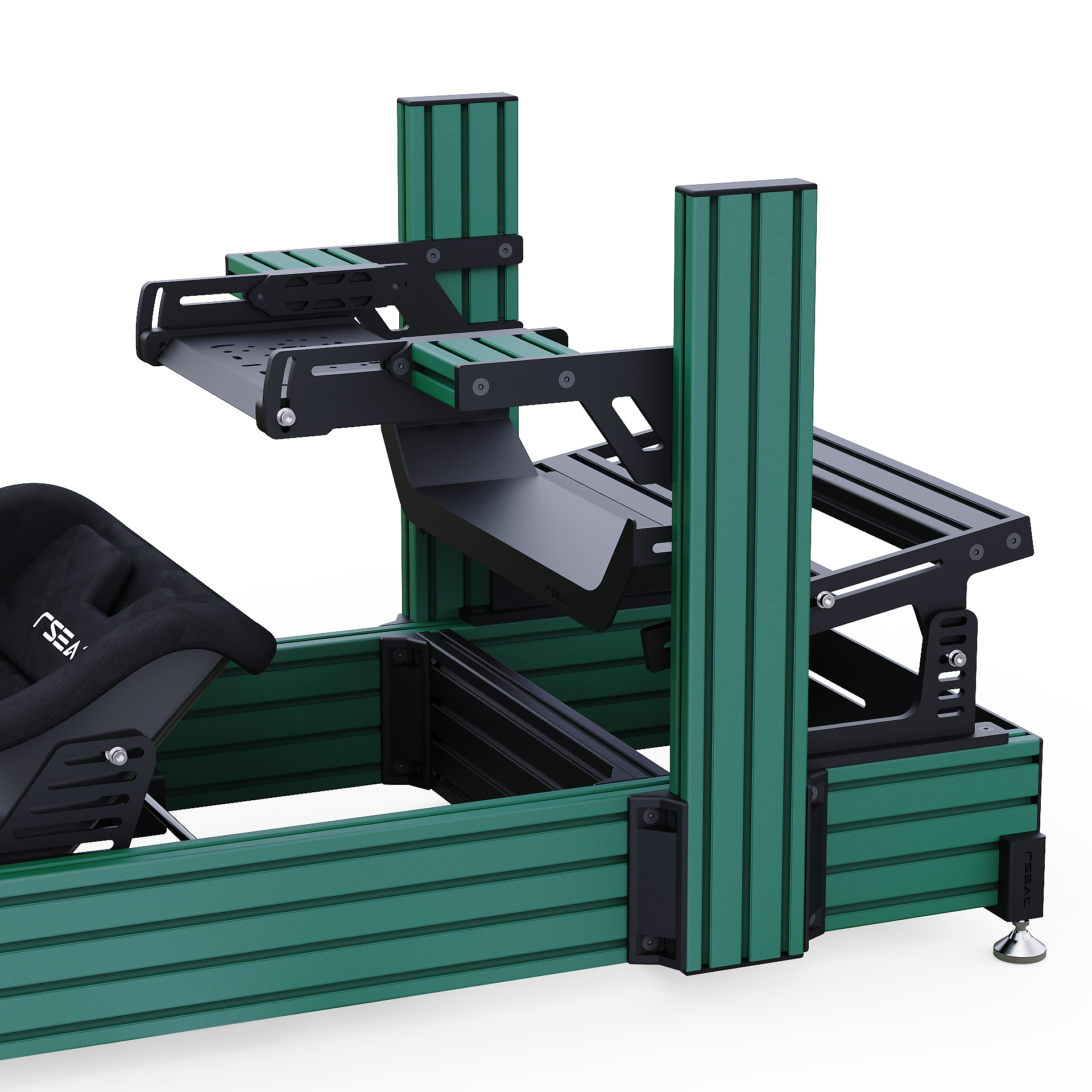 Our dedicated Front Mount wheelbase support (mounting points on the front side of the wheelbase) provides Ultimate Stability as well as Linear, Tilt, and Height adjustment in seconds. Support any High-End front mount wheelbase on the market, including Simucube, VRS, other MiGE Motor-type wheelbases, etc.… Quick Forward-Backwards adjustment via four bolts (most cockpits require moving the whole assembly, including the on-chassis monitor stand, only to be able to adjust the wheelbase position). The assembly comprises thick Laser Cut carbon steel and a matte black powder coat finish. Zero-Flex guaranteed!