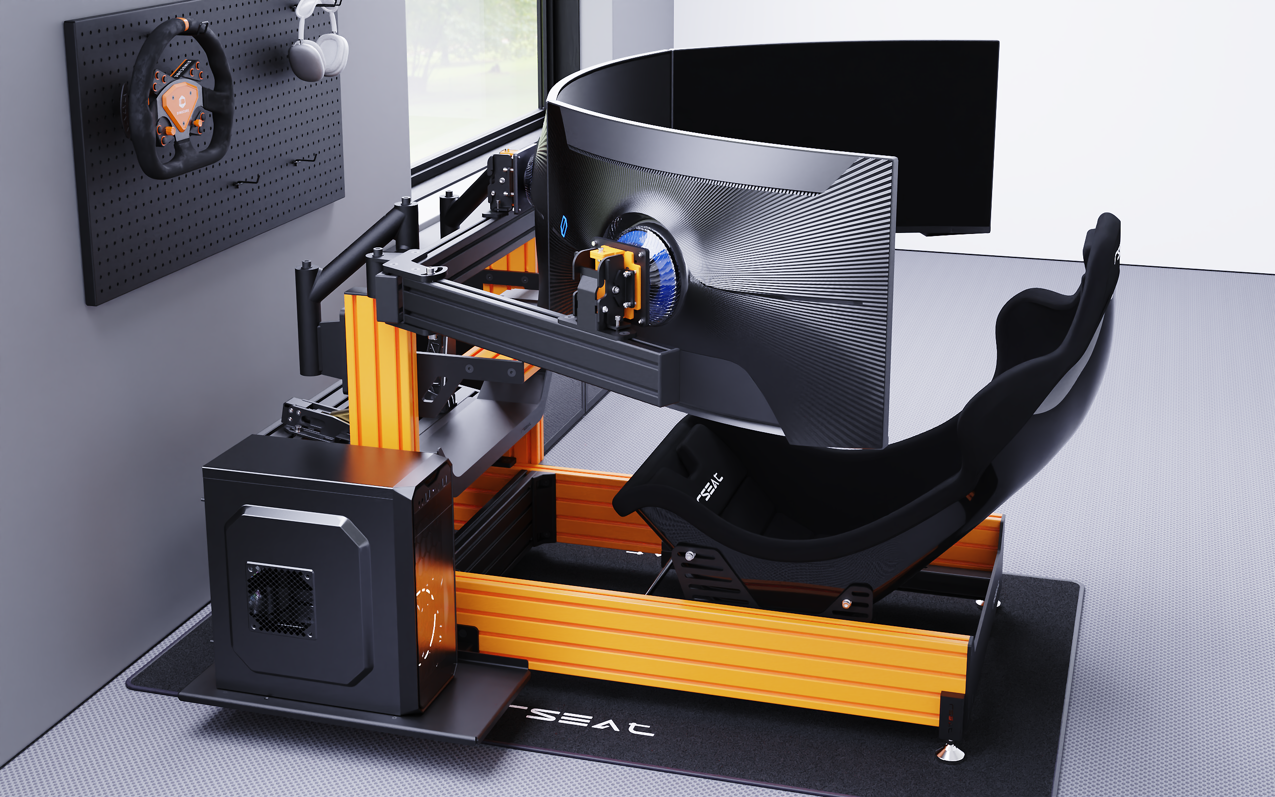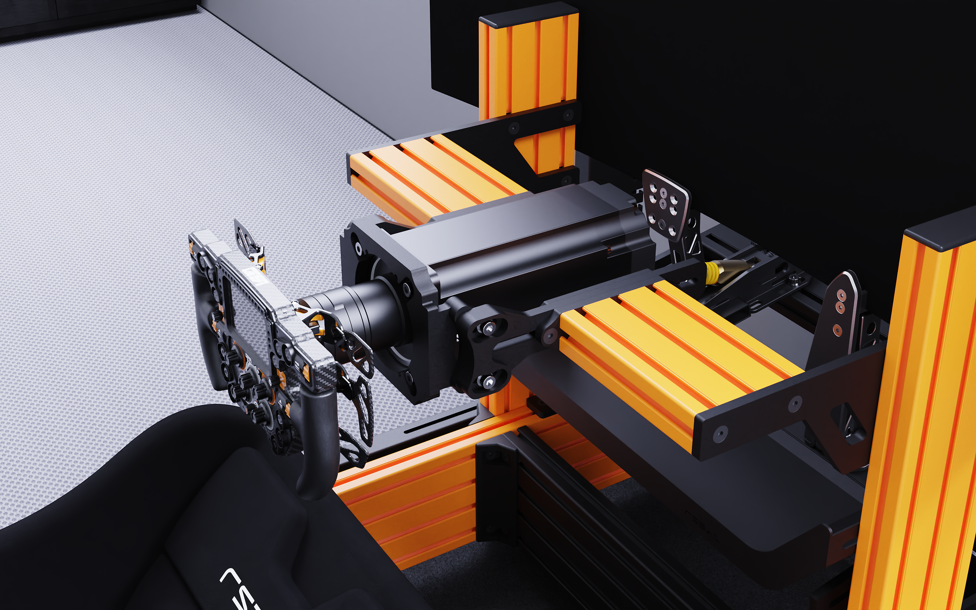 Our dedicated Front Mount wheelbase support (mounting points on the front side of the wheelbase) provides Ultimate Stability as well as Linear, Tilt, and Height adjustment in seconds. Support any High-End front mount wheelbase on the market, including Simucube, VRS, other MiGE Motor-type wheelbases, etc.… Quick Forward-Backwards adjustment via four bolts (most cockpits require moving the whole assembly, including the on-chassis monitor stand, only to be able to adjust the wheelbase position). The assembly comprises thick Laser Cut carbon steel and a matte black powder coat finish. Zero-Flex guaranteed!