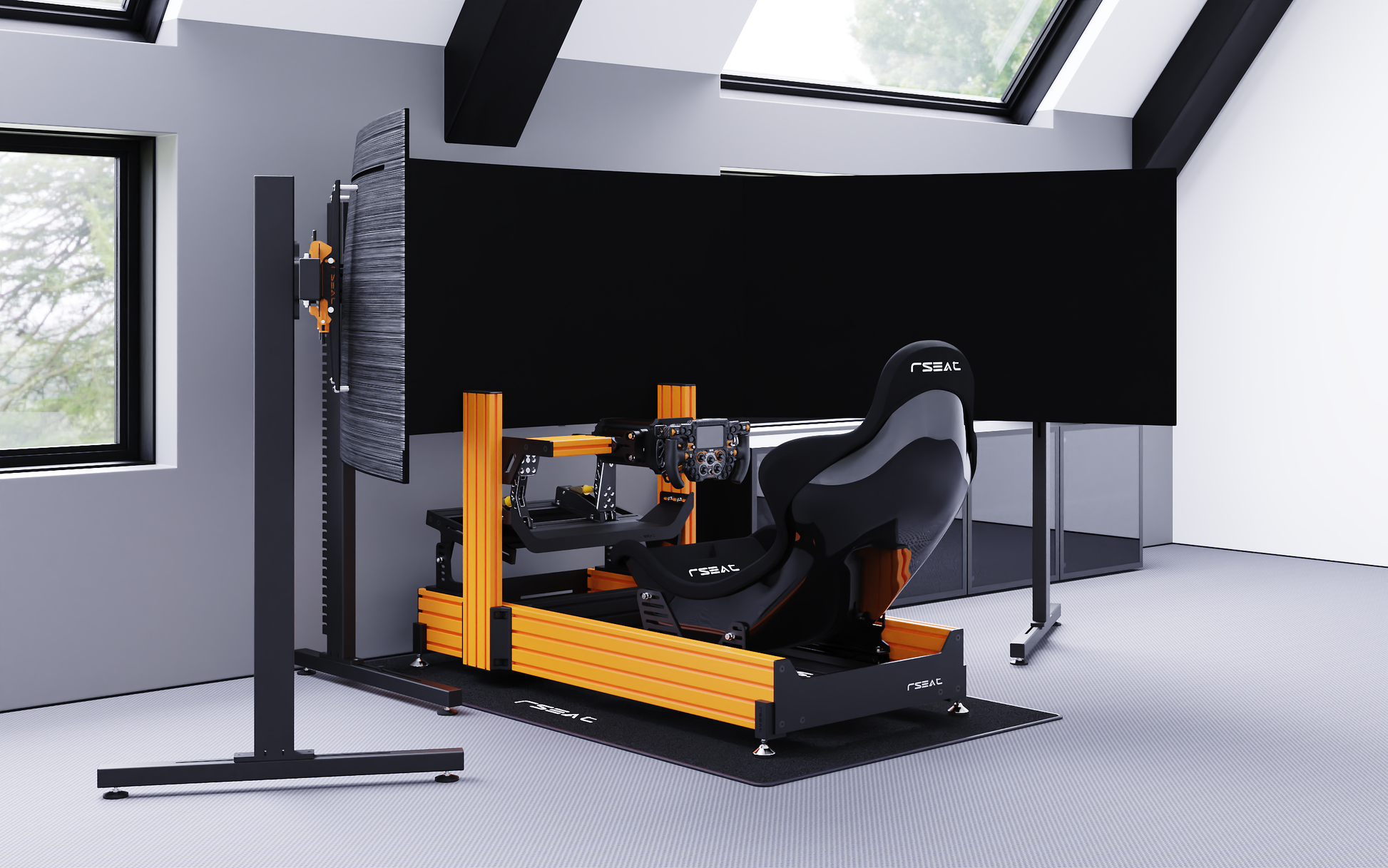 The required minimum footprint for the A1 PRO Formula chassis, RSEAT Formula seat, and TX32 stand-alone single-screen monitor stand. (supports up to 3 x 32-inch Monitors).