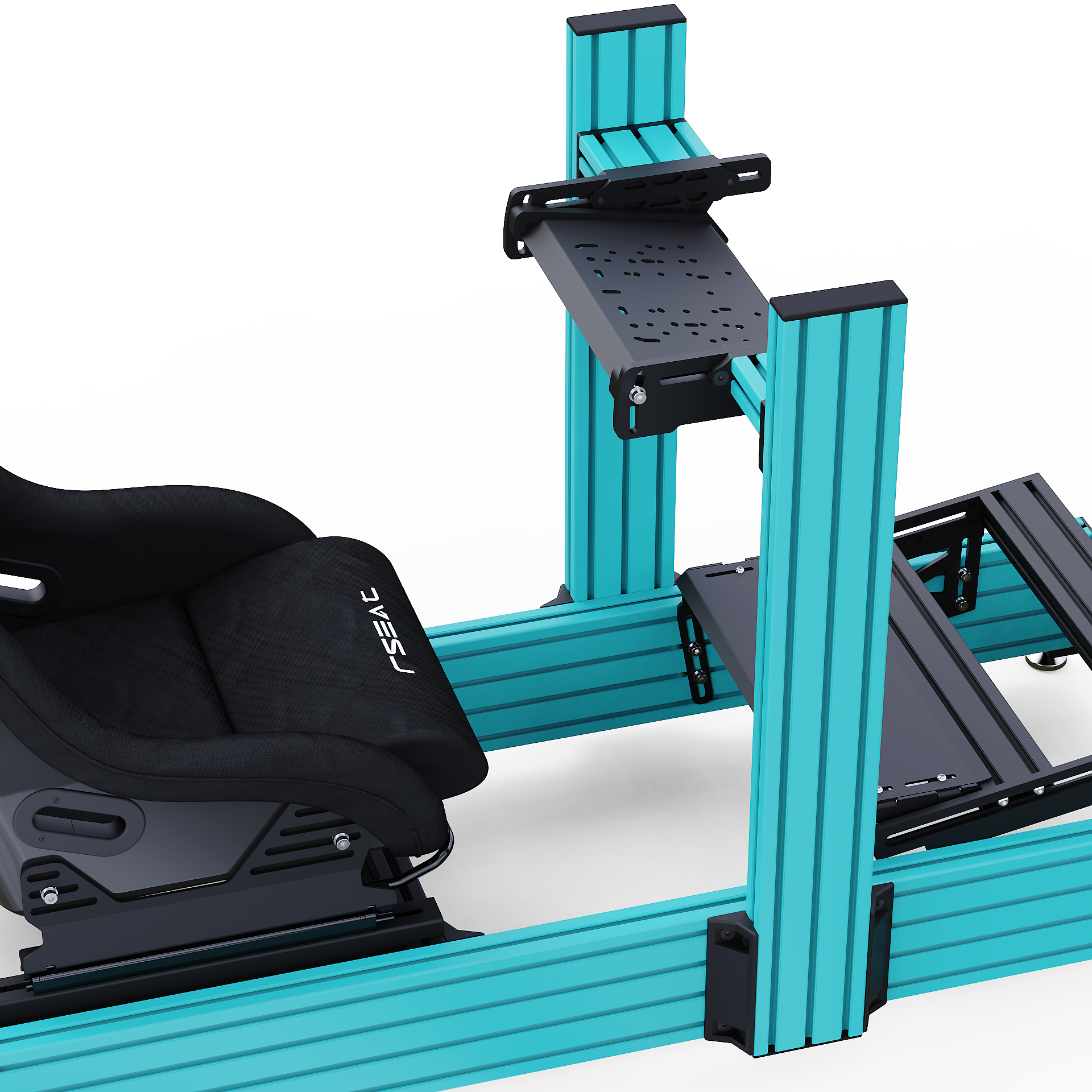 Our dedicated Front Mount wheelbase support (mounting points on the front side of the wheelbase) provides Ultimate Stability as well as Linear, Tilt, and Height adjustment in seconds. Support any High-End front mount wheelbase on the market, including Simucube, VRS, other MiGE Motor-type wheelbases, etc.… Quick Forward-Backwards adjustment via four bolts (most cockpits require moving the whole assembly, including the on-chassis monitor stand, only to be able to adjust the wheelbase position). The assembly comprises thick Laser Cut carbon steel and a matte black powder coat finish. Zero-Flex guaranteed!