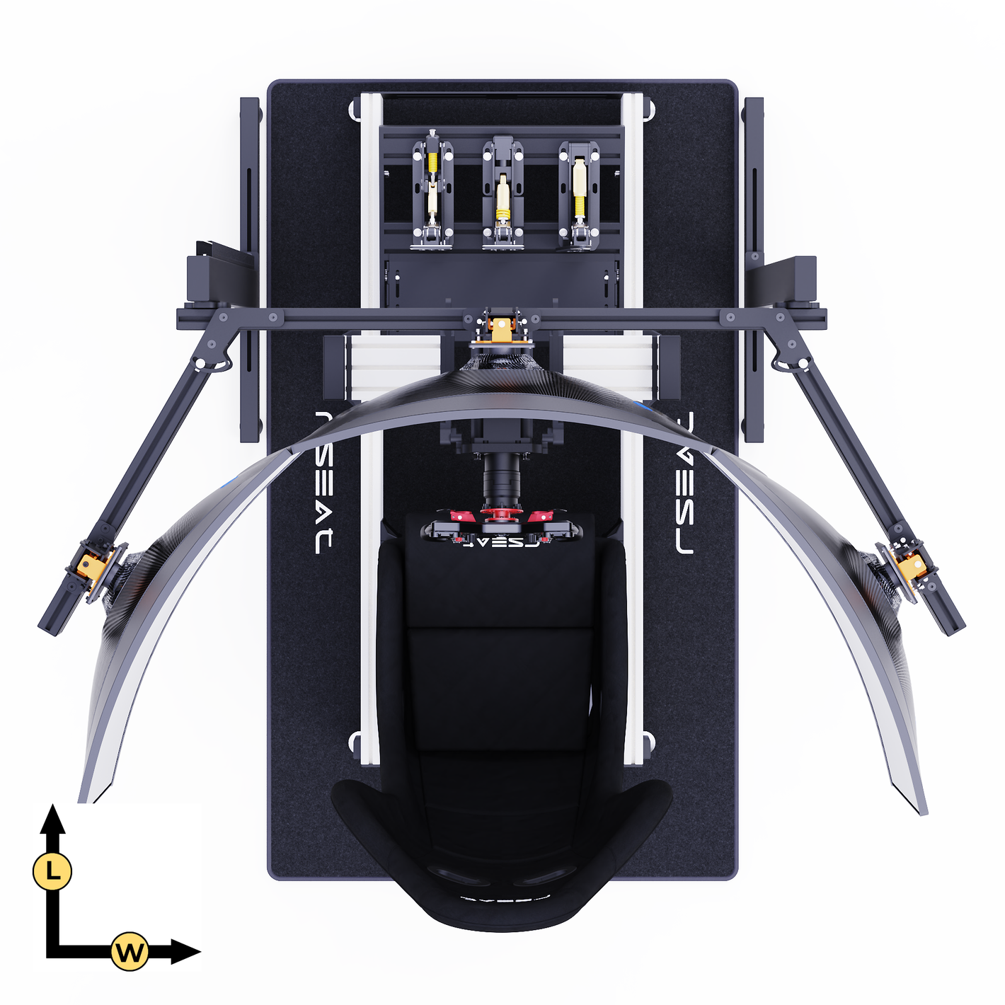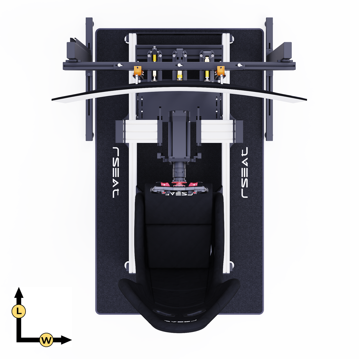 The required minimum footprint for the A1 PRO GT chassis, RSEAT GT seat, and SX90 stand-alone single-screen TV/monitor stand.