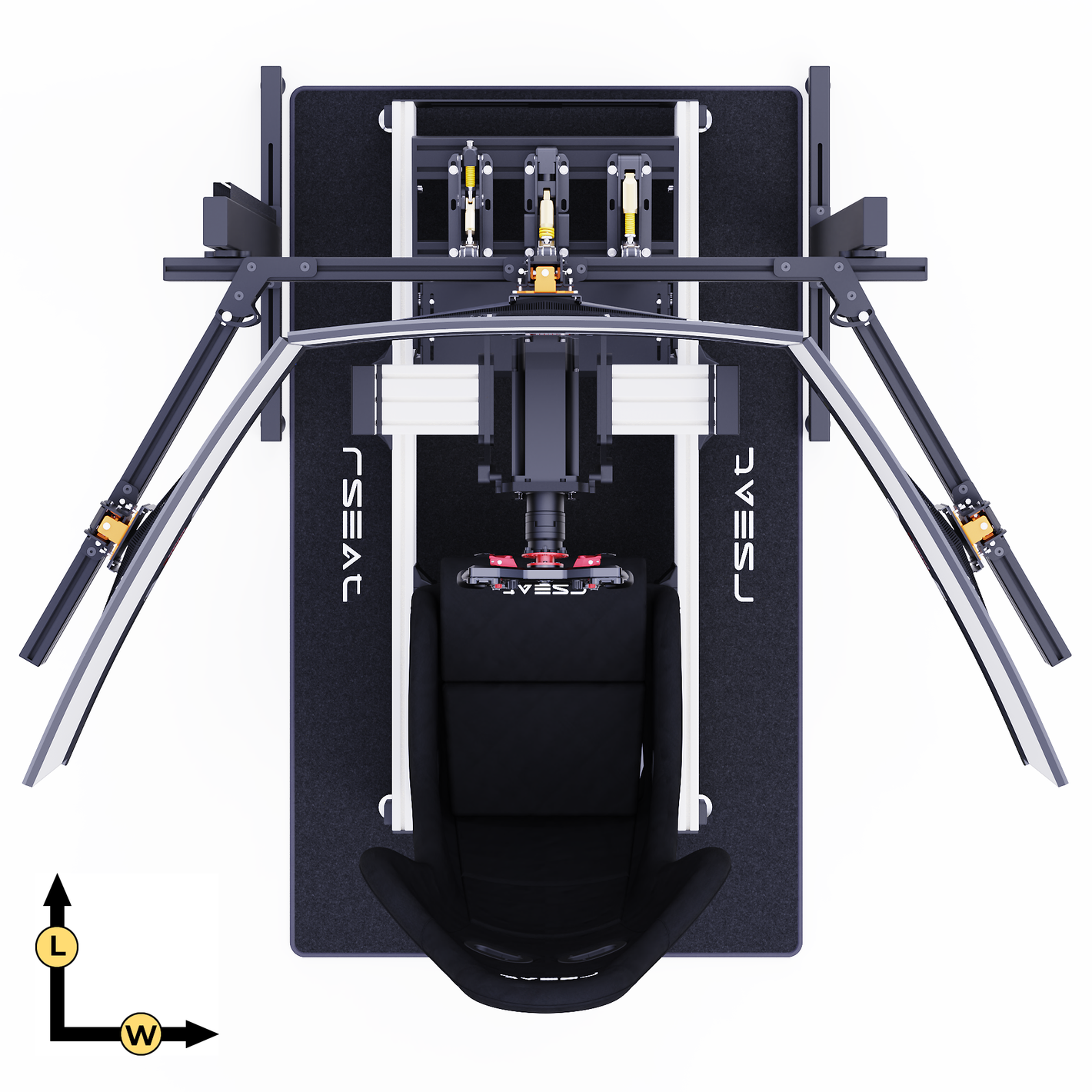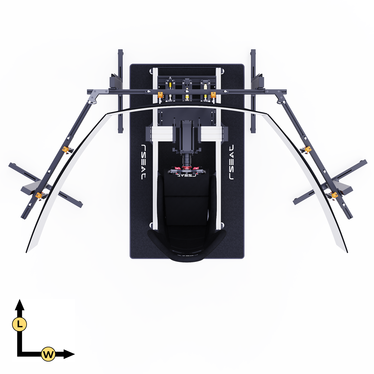 The required minimum footprint for the A1 PRO GT chassis, RSEAT GT seat, and TX32 stand-alone single-screen monitor stand. (supports up to 3 x 32-inch Monitors).