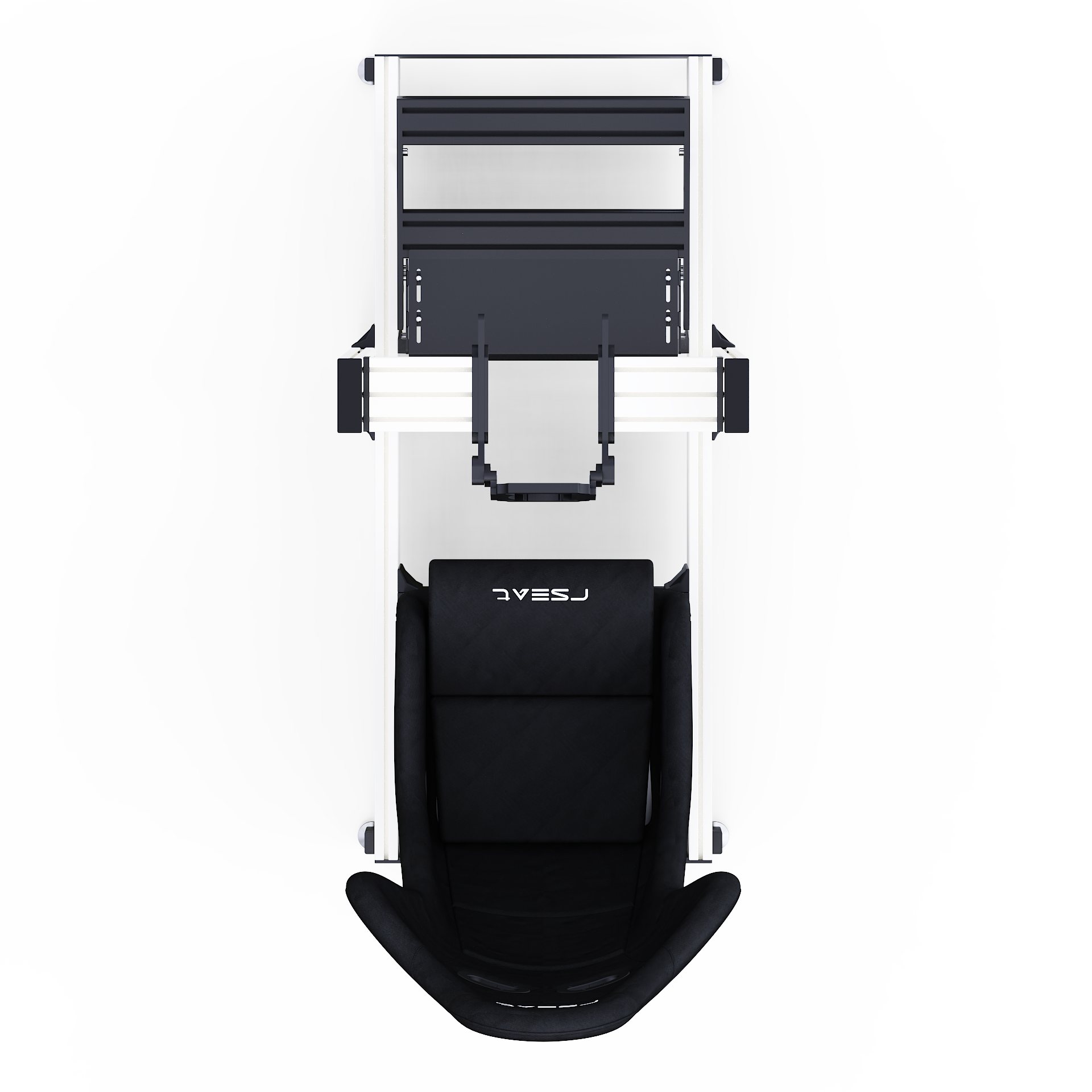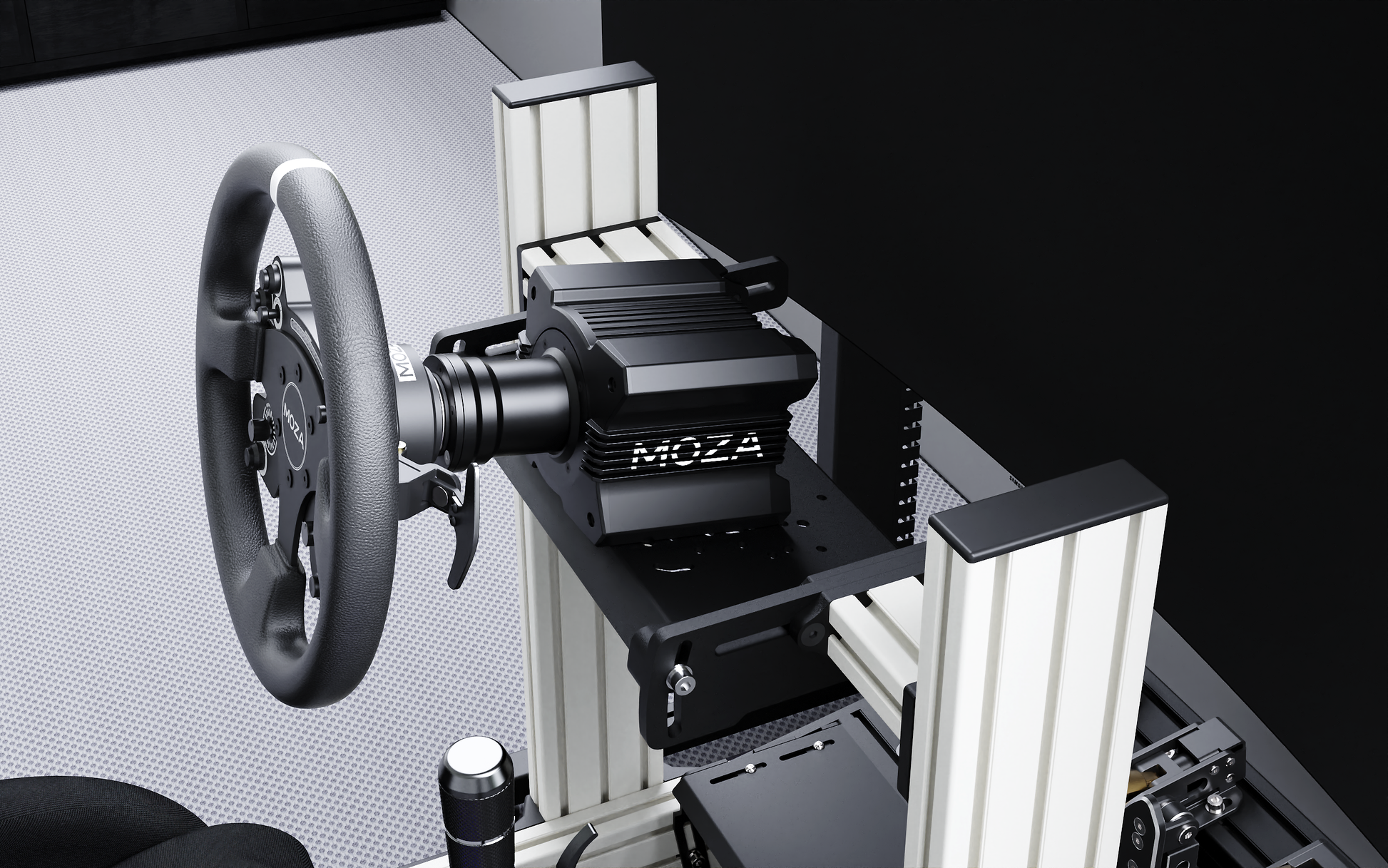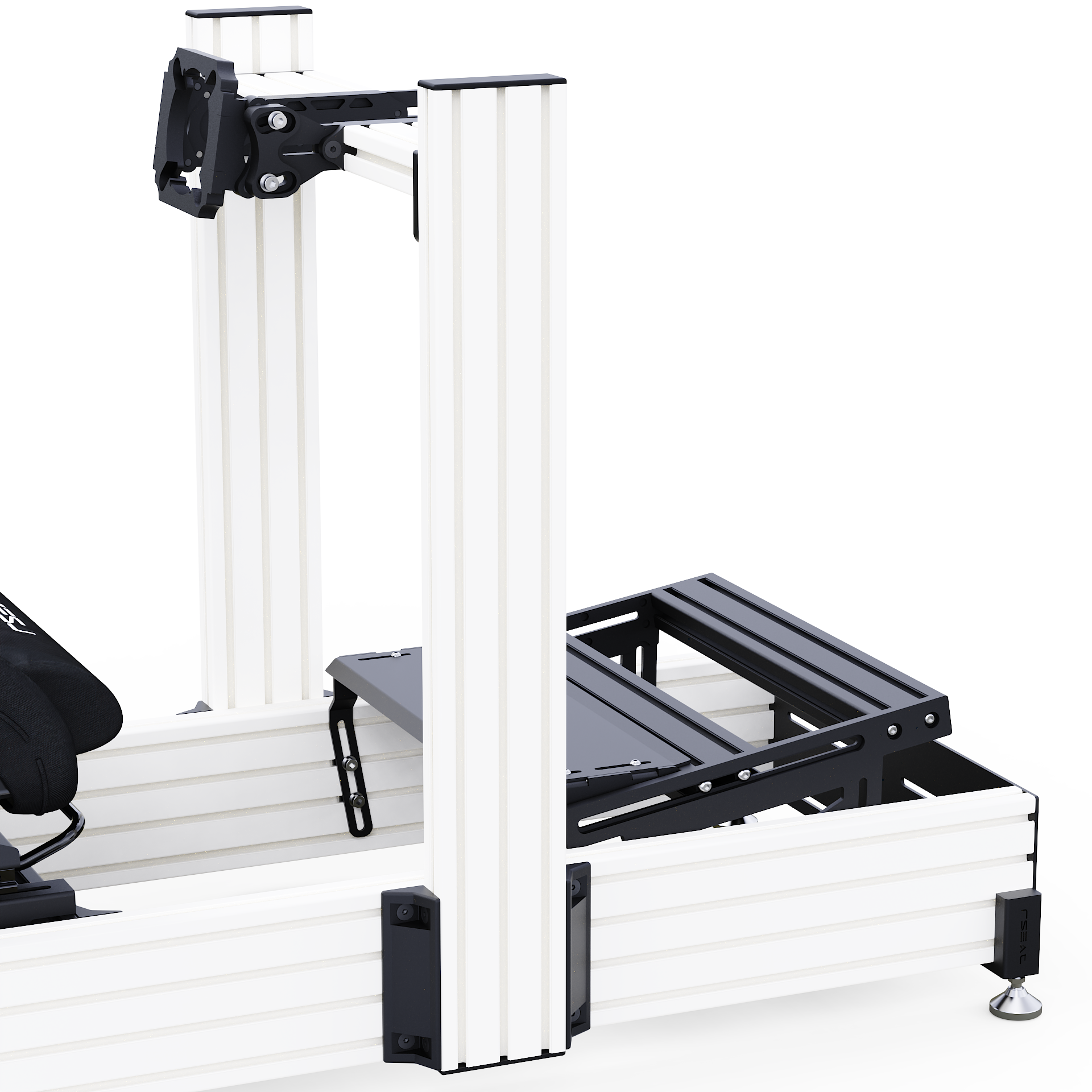Our dedicated Front Mount wheelbase support (mounting points on the front side of the wheelbase) provides Ultimate Stability as well as Linear, Tilt, and Height adjustment in seconds. Support any High-End front mount wheelbase on the market, including Simucube, VRS, other MiGE Motor-type wheelbases, etc.… Quick Forward-Backwards adjustment via four bolts (most cockpits require moving the whole assembly, including the on-chassis monitor stand, only to be able to adjust the wheelbase position). The assembly comprises thick Laser Cut carbon steel and a matte black powder coat finish. Zero-Flex guaranteed!